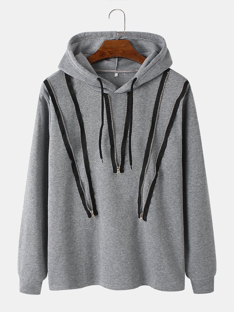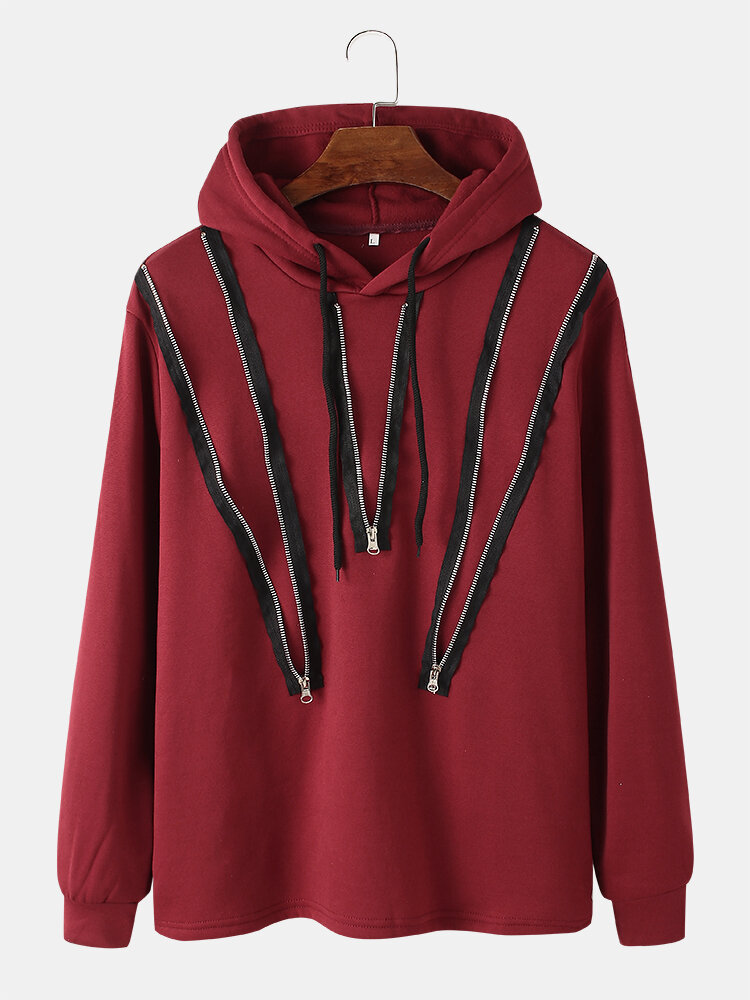 Mens Scratches Zipper Detail Street Style Casual Drawstring Hoodie – Red L