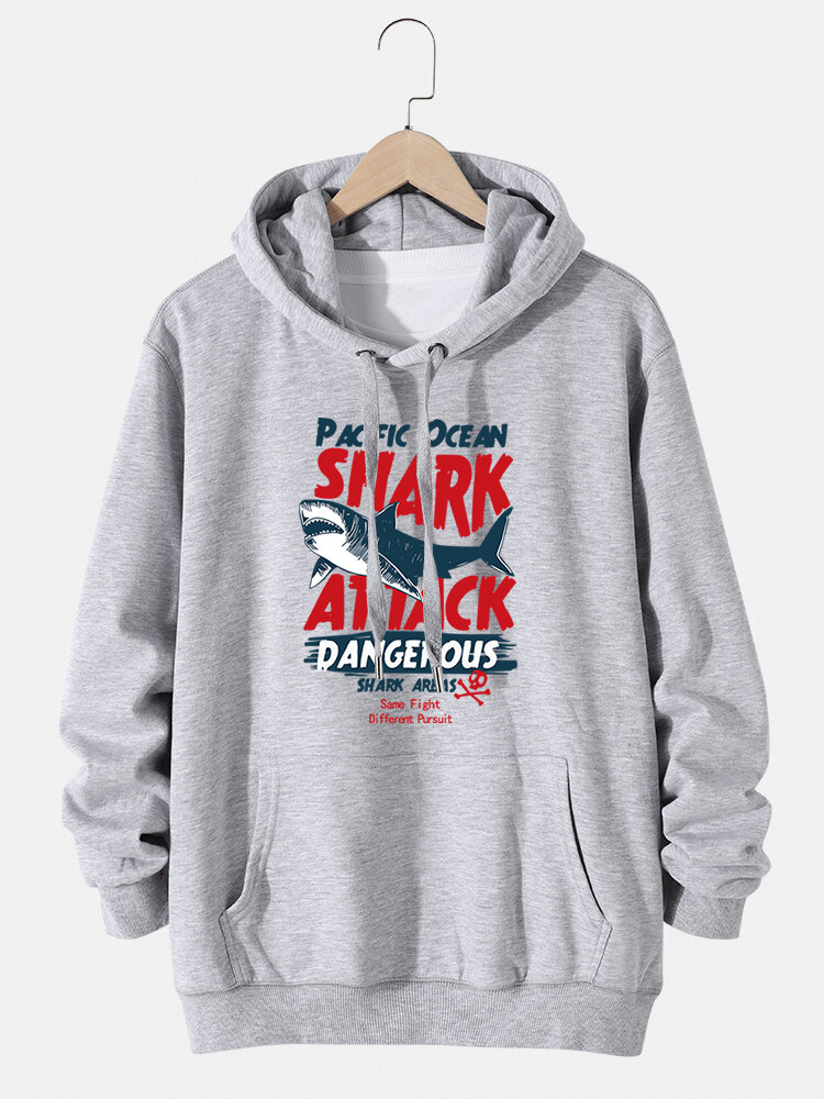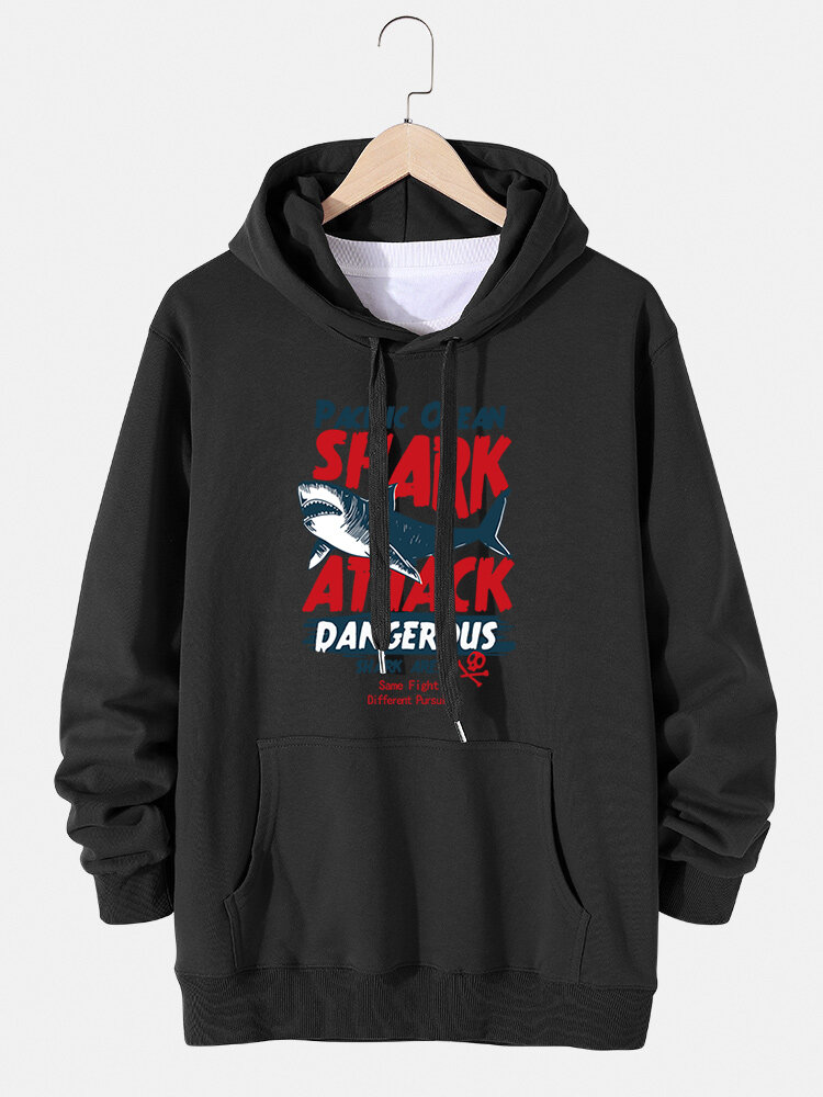 Mens Shark Letter Print Cotton Kangaroo Pocket Drawstring Hoodies – Black 4XL