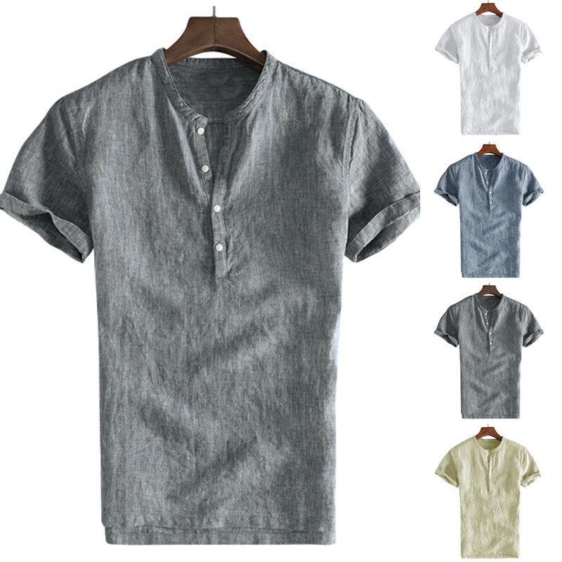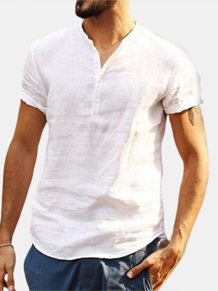 Men’s Short Sleeve Collarless Neck T Shirts Beach Casual Cool Tops Blouse – S White