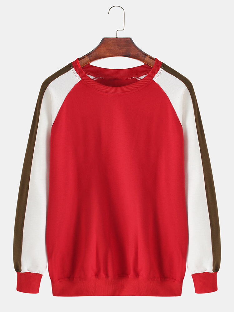 Mens Side Stripe Round Neck Raglan Long Sleeves Pullover Cotton Sweatshirts – Red 2XL