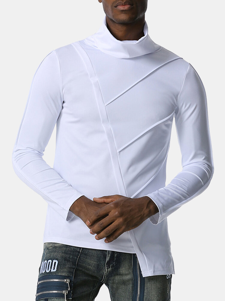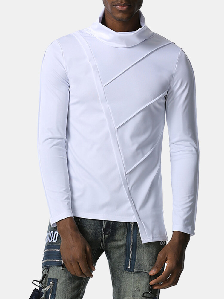 Mens Simple Solid Color High Neck Asymmetrical Hem Long Sleeve T-Shirts – Navy S