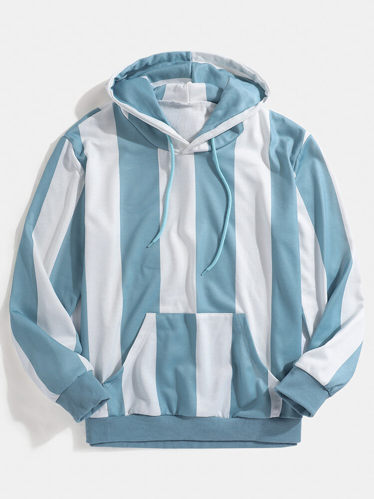 Mens Simple Stripe Print Long Sleeve Kangaroo Pocket Hoodies – Sky Blue S