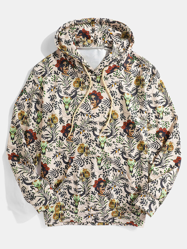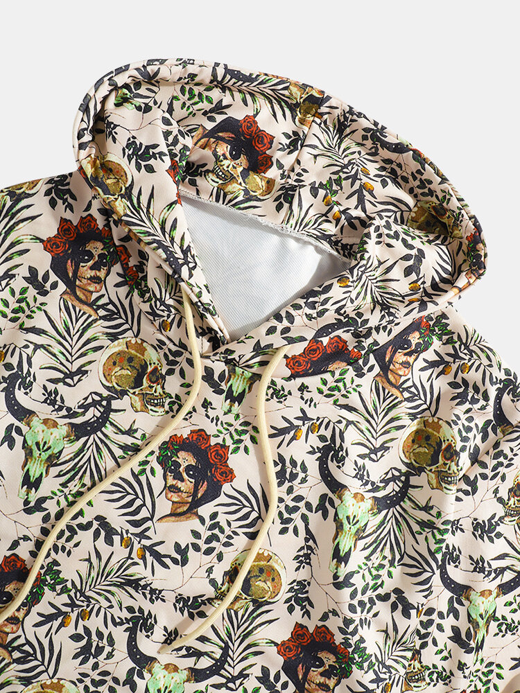 Mens Skeleton & Leaves Plant Print Kangaroo Pocket Long Sleeve Casual Hoodies – Apricot S