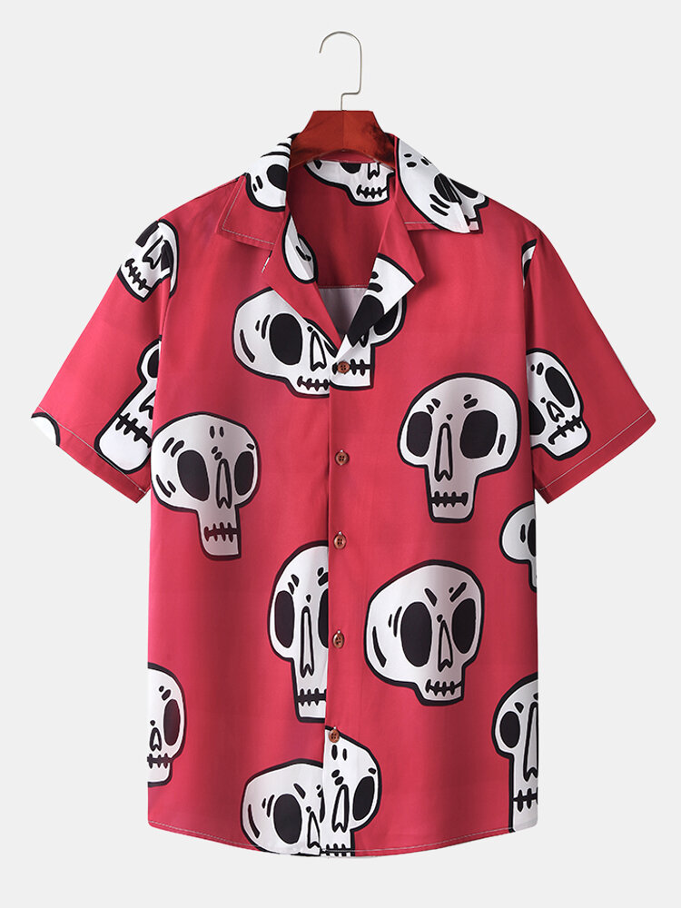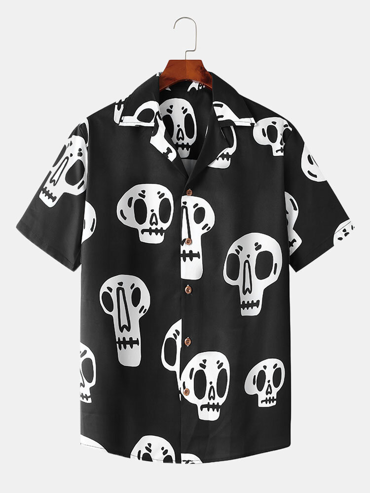 Mens Skeleton Print Revere Collar Short Sleeve Shirt – Black M