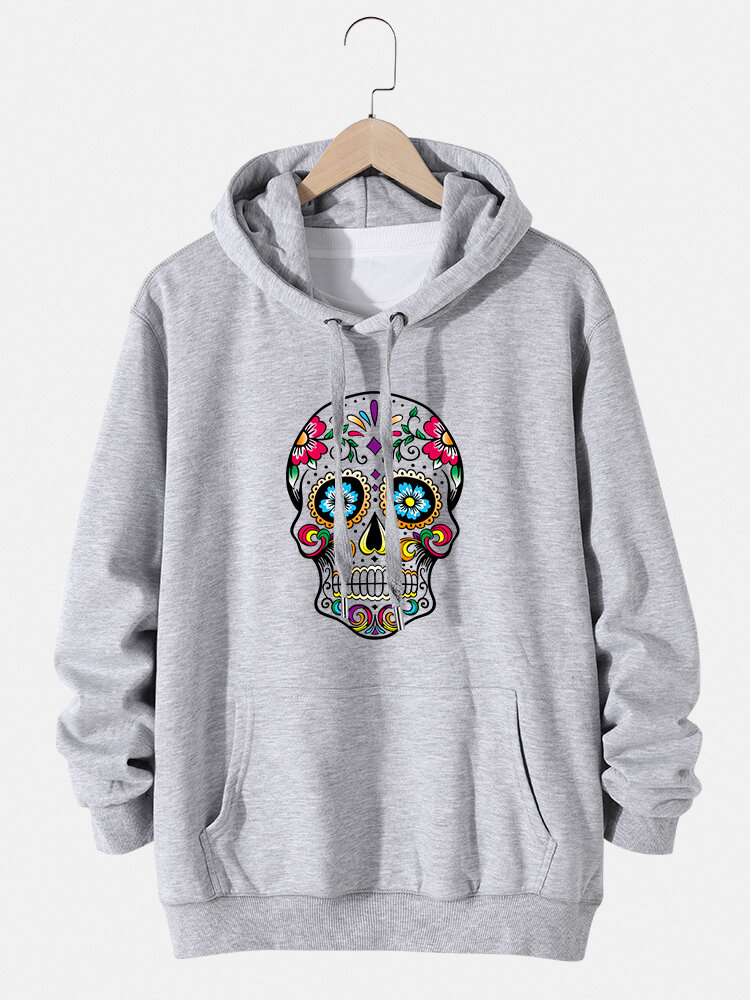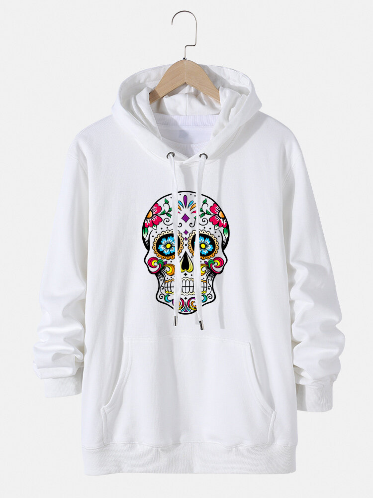 Mens Skull Floral Printed Cotton Drawstring Hoodies With Pouch Pocket – Black XL