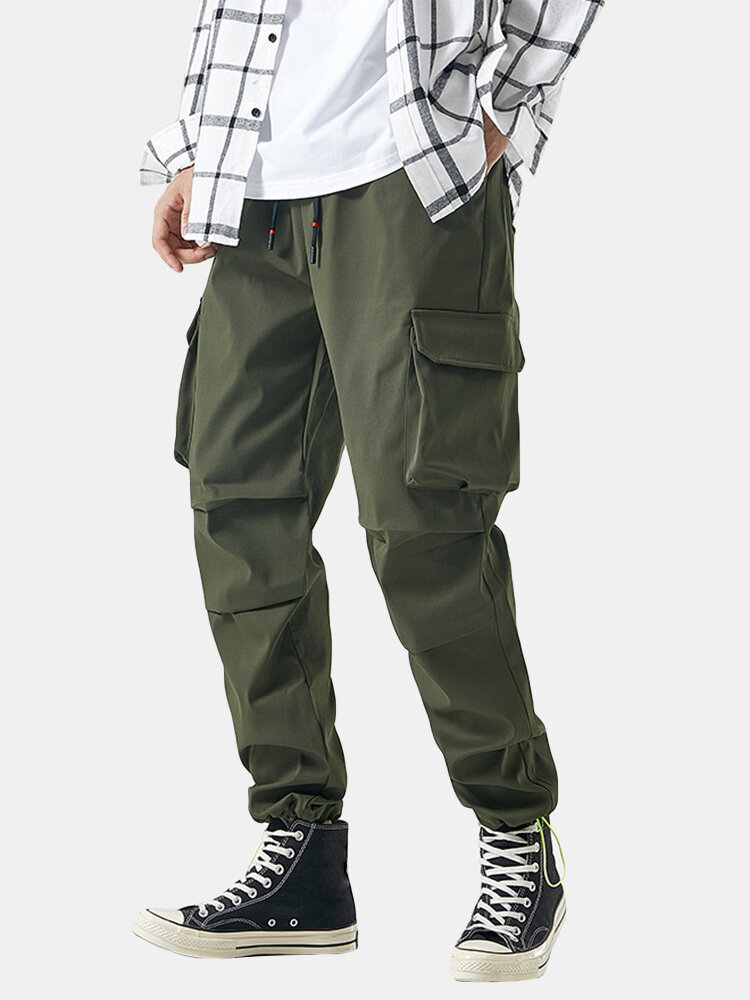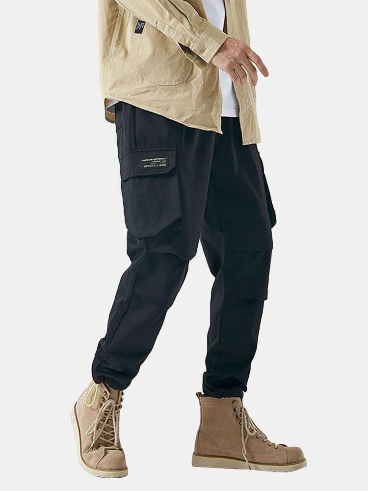 Mens Solid Applique Cotton Drawstring Cuff Cargo Pants With Multi Pockets – Grey S