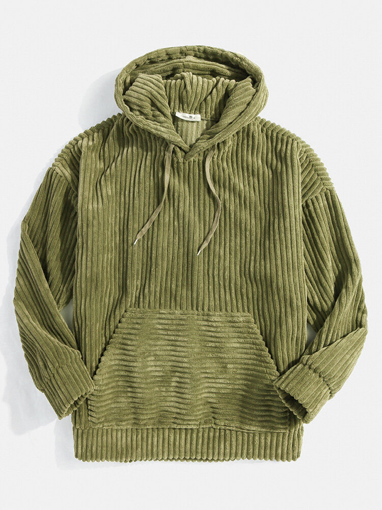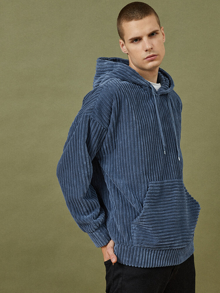 Mens Solid Color Corduroy Kangaroo Pocket Drop Shoulder Hoodies