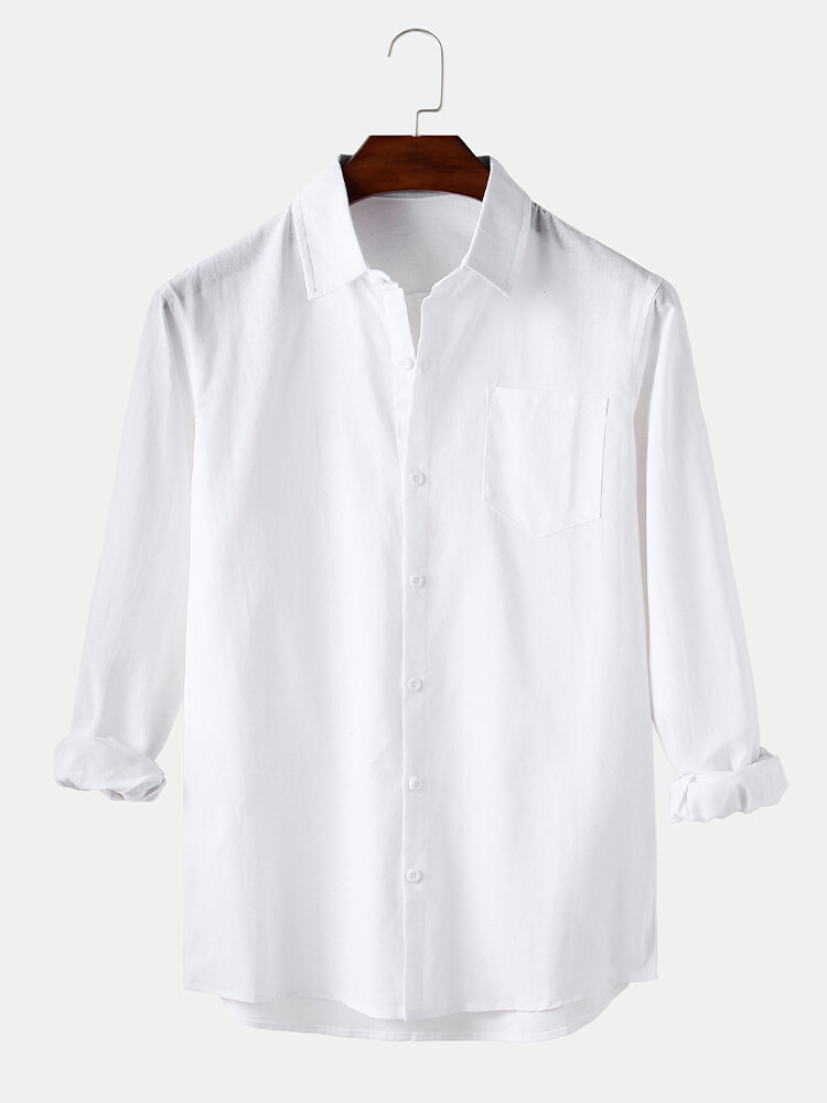 Mens Solid Color Cotton Business Casual Long Sleeve Shirts With Pocket – White S