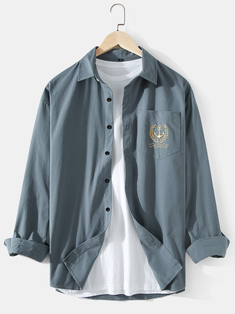 Mens Solid Color Embroidery Pocket Button Up Long Sleeve Simple Cotton Shirts – White L