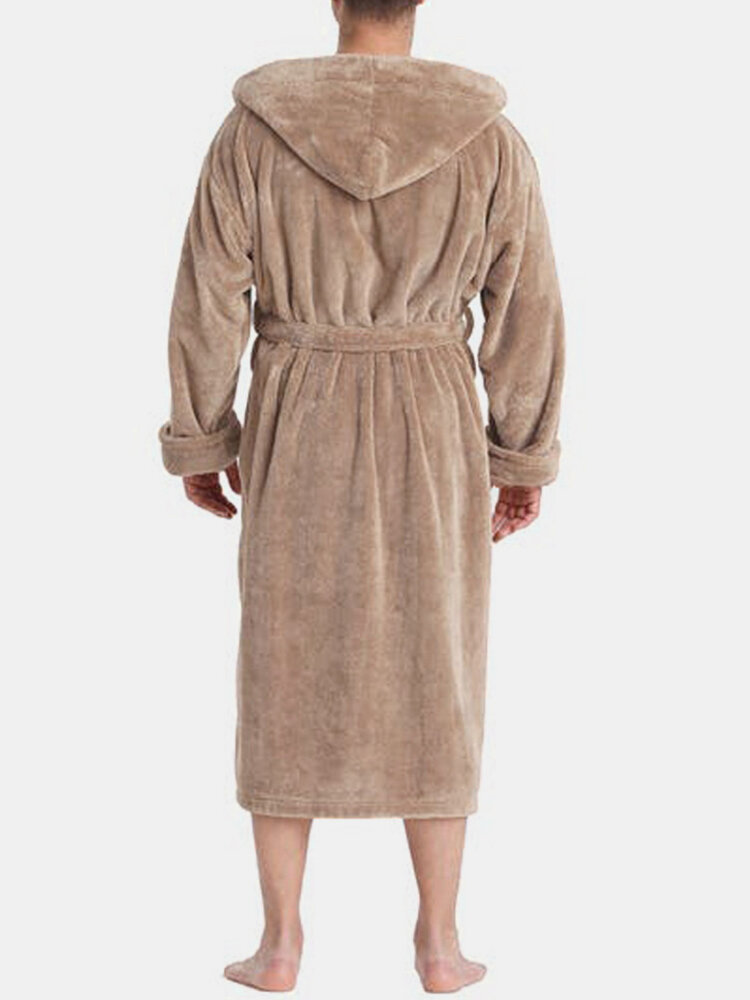 Mens Solid Color Flannel Thicken Warm Lace-Up Home Hooded Robe – Black L