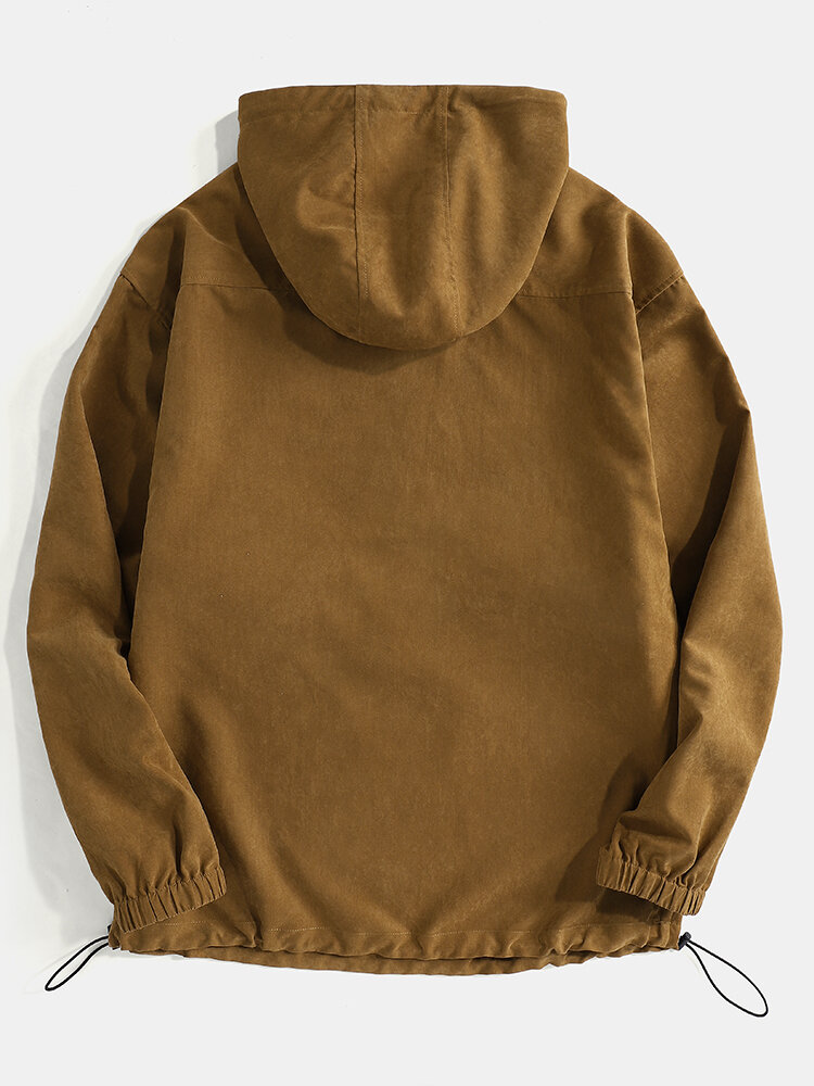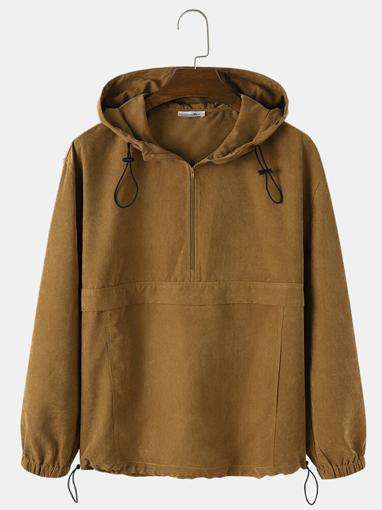 Mens Solid Color Half Zipper Drawstring Hem Hoodie With Kangaroo Pocket – Brown S
