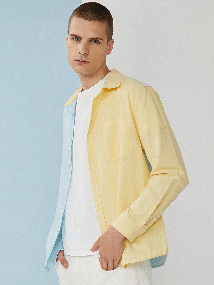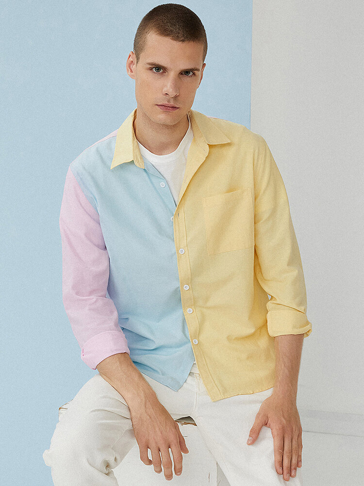 Mens Solid Color Patchwork Button Up Lapel Long Sleeve Design Shirts – Yellow S