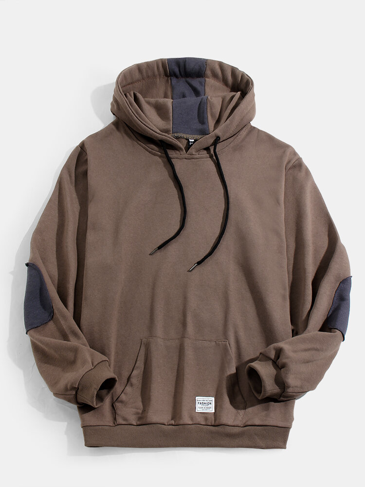 Mens Solid Color Patchwrok Drawstring Hoodies With Pocket – 3XL Khaki