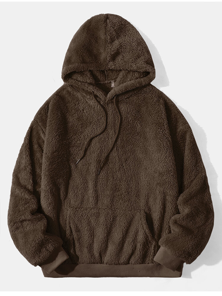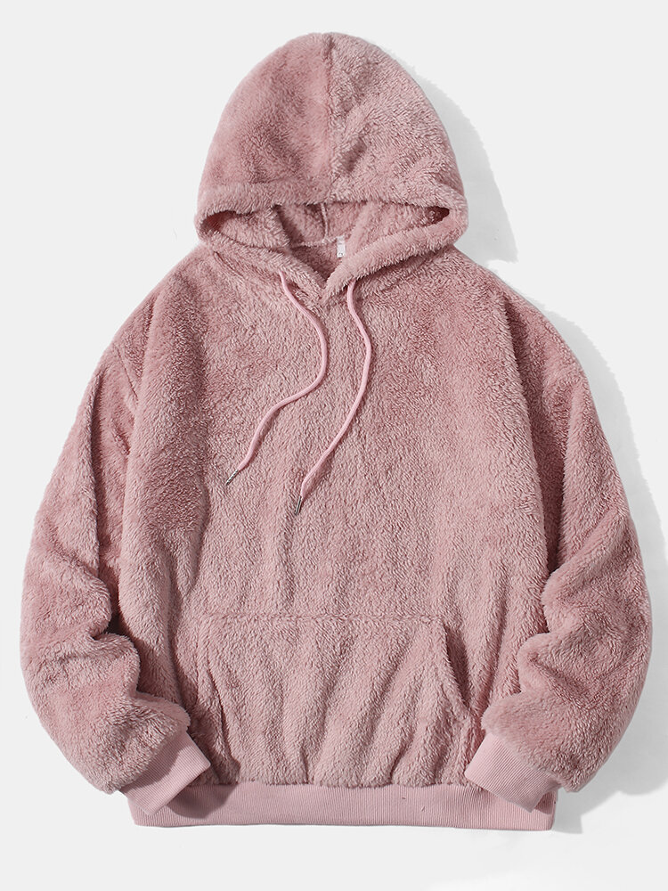 Mens Solid Color Plush Pouch Pocket Fluffy Long Sleeve Hoodies – Grey M