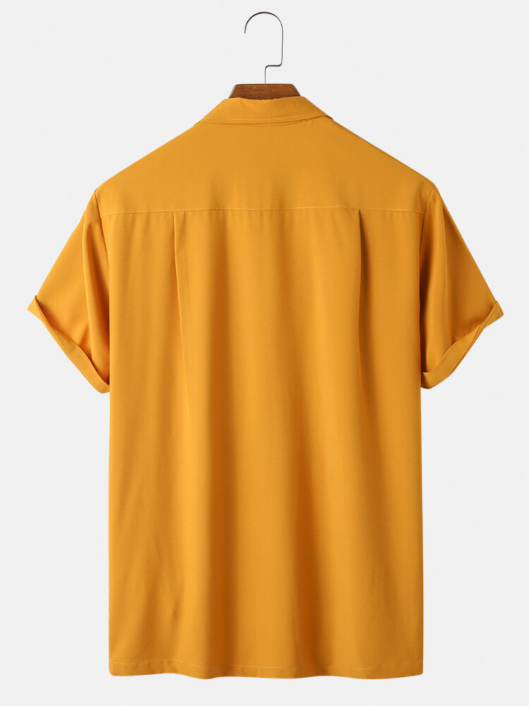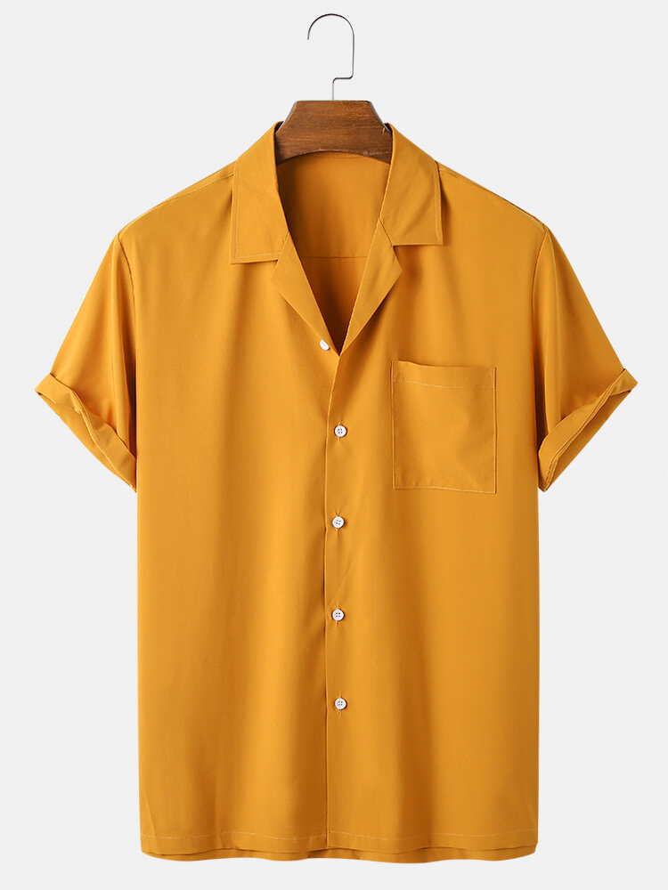 Mens Solid Color Revere Collar Chest Pocket Simple Short Sleeve Shirts – Yellow L
