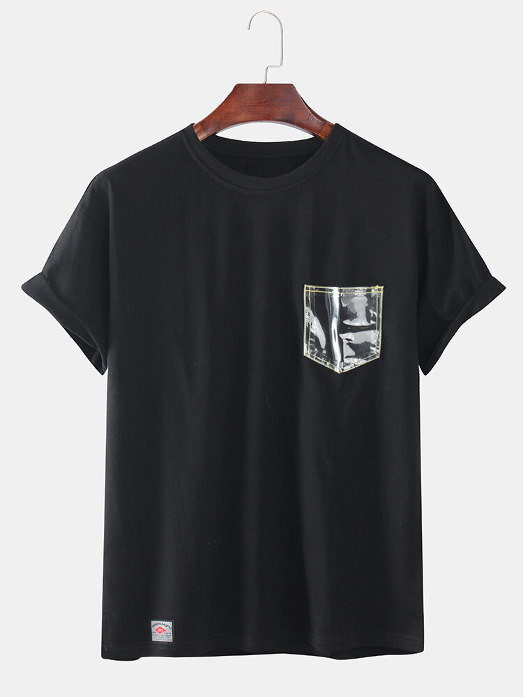 Mens Solid Color See Though Pocket Short Sleeve Casual T-Shirts – White 3XL