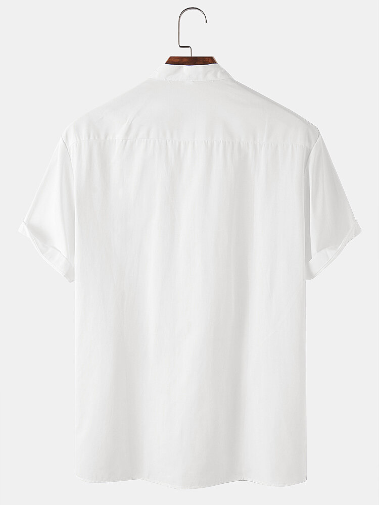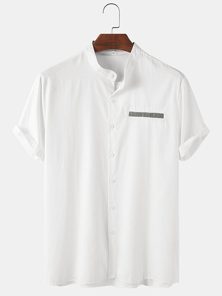 Mens Solid Color Stand Collar Casual Short Sleeve Shirts – White S
