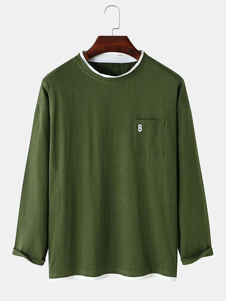 Mens Solid Long Sleeve Embroidery Splicing T-Shirt – Khaki L