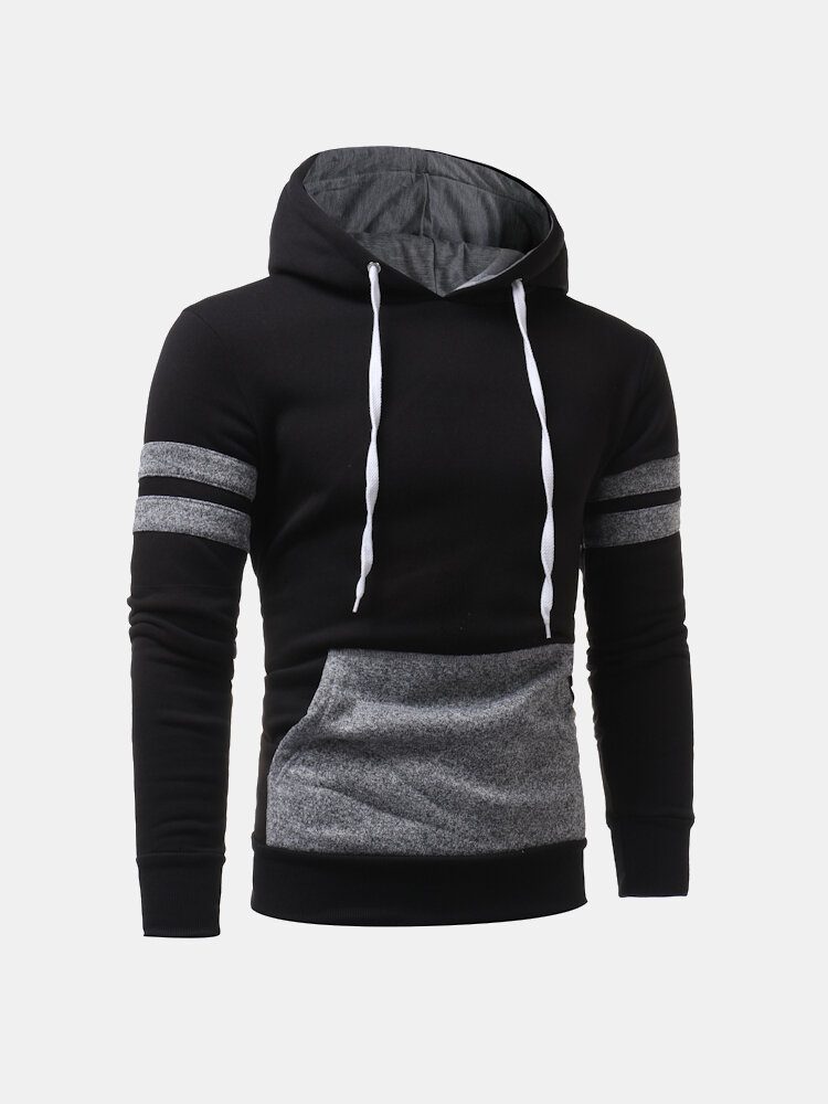 Mens Solid Patchwork Kangaroo Pocket Long Sleeve Cotton Drawstring Hoodies – Dark Grey L
