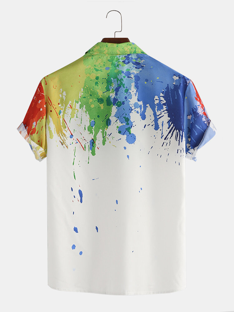 Mens Splash Ink Watercolor Print Short Sleeve Beach Party Business Casual Shirts – S Colorful