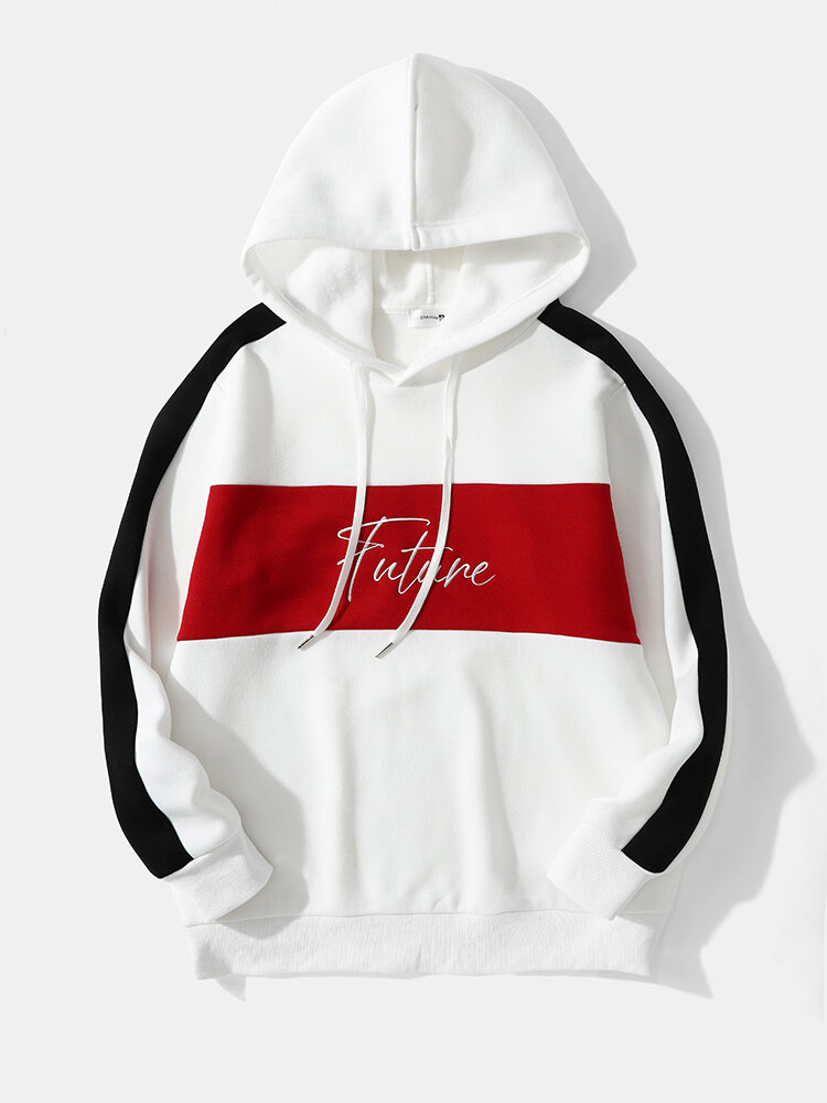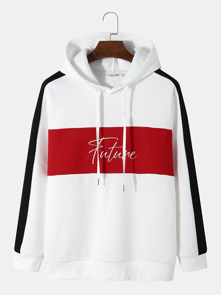 Mens Splicing Panel Letter Contrast Color Drawstring Hoodies – White S