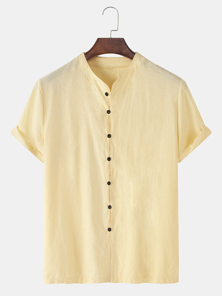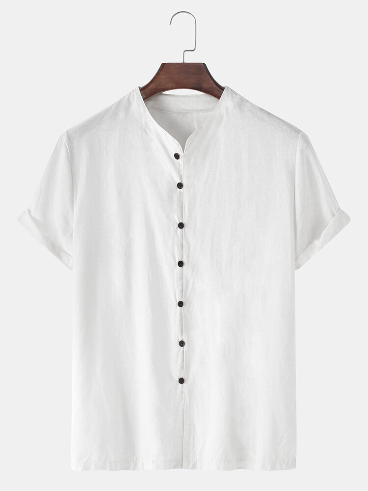 Description:Decoration:ButtonFit Type:Regular FitMaterial:FlaxNeckline:Stand CollarPattern Type:SolidScene:Leisure,Home,CasualSeason:SummerSize:XXL,L,S,XL,MSleeve:Short SleeveStyle:CasualThickness:Regular