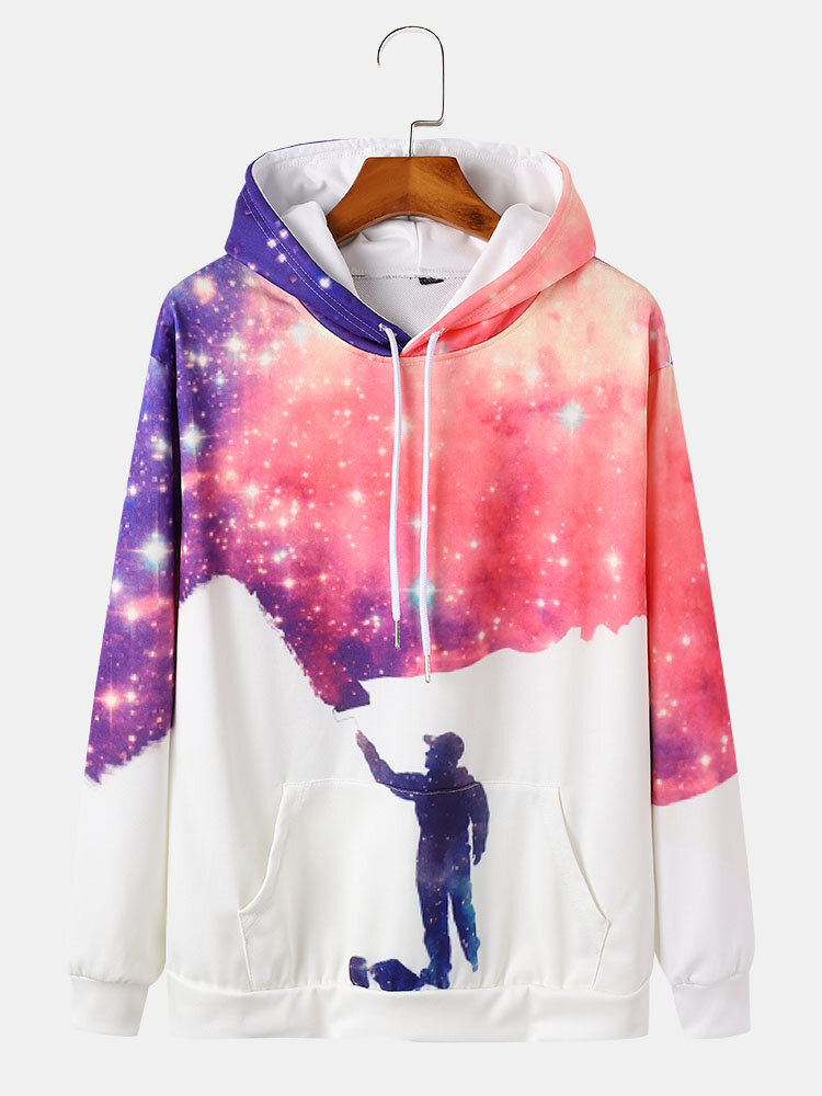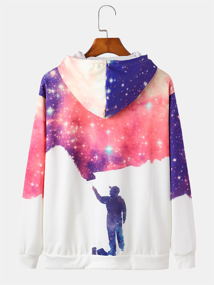 Mens Starry Sky Figure Print Casual Drawstring Pullover Hoodies – White M