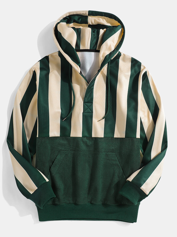 Mens Stripe Corduroy Patchwork Casual Pouch Pocket Button Henley Hoodies – Green 2XL