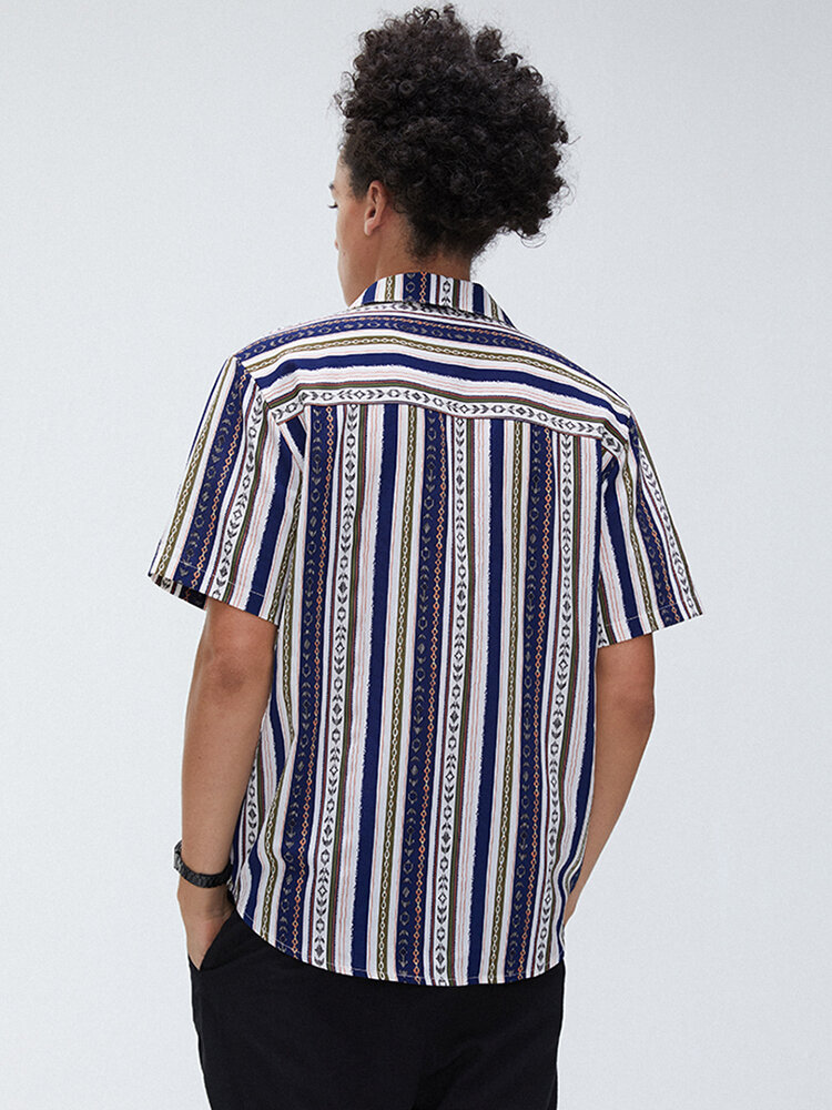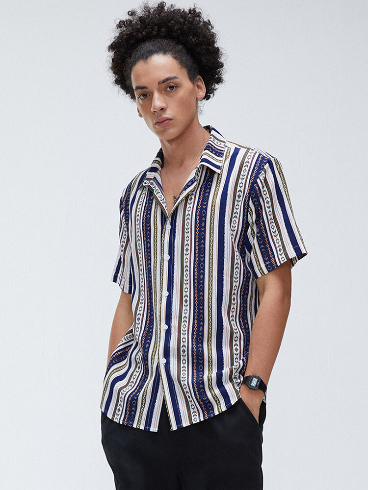 Mens Stripe Ethnic Style Turn Down Collar Short Sleeve Casual Shirts – 3XL Blue