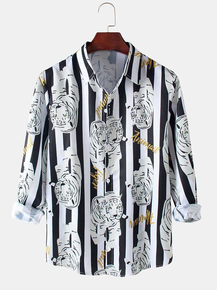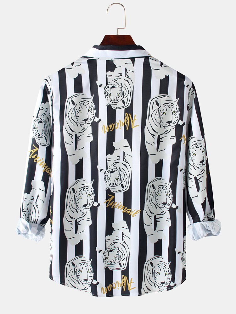 Mens Stripe Tiger Print Button Up Long Sleeve Designer Shirts – White XL