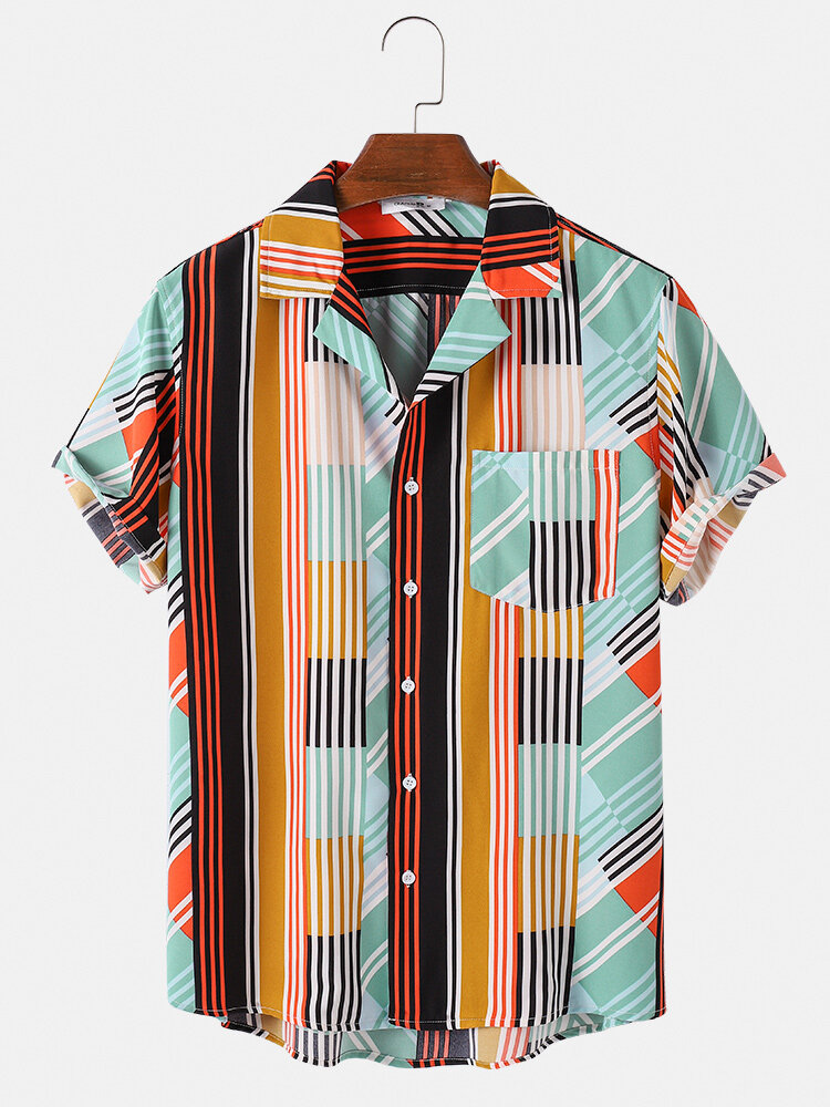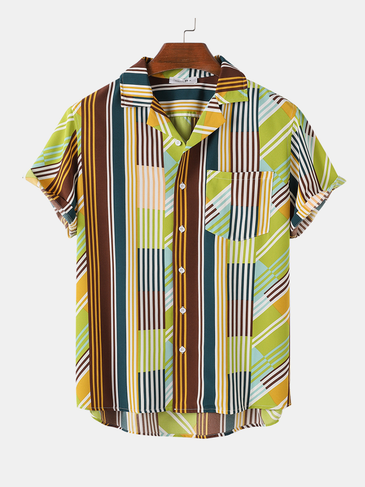 Mens Striped Color Block Patchwork Revere Collar Short Sleeve Shirts – Green S