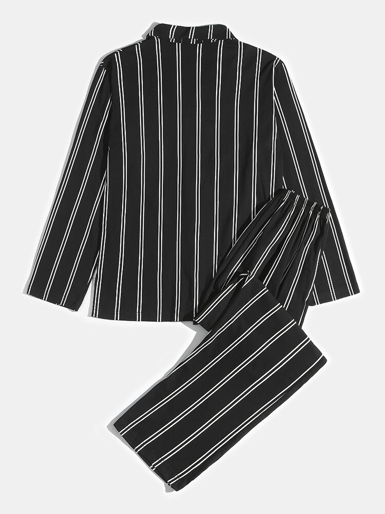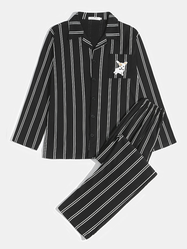 Mens Striped Cute Dog Embroidery Cotton Lapel Two-Piece Home Pajamas Sets – Black S