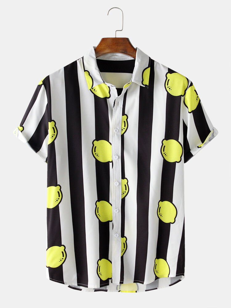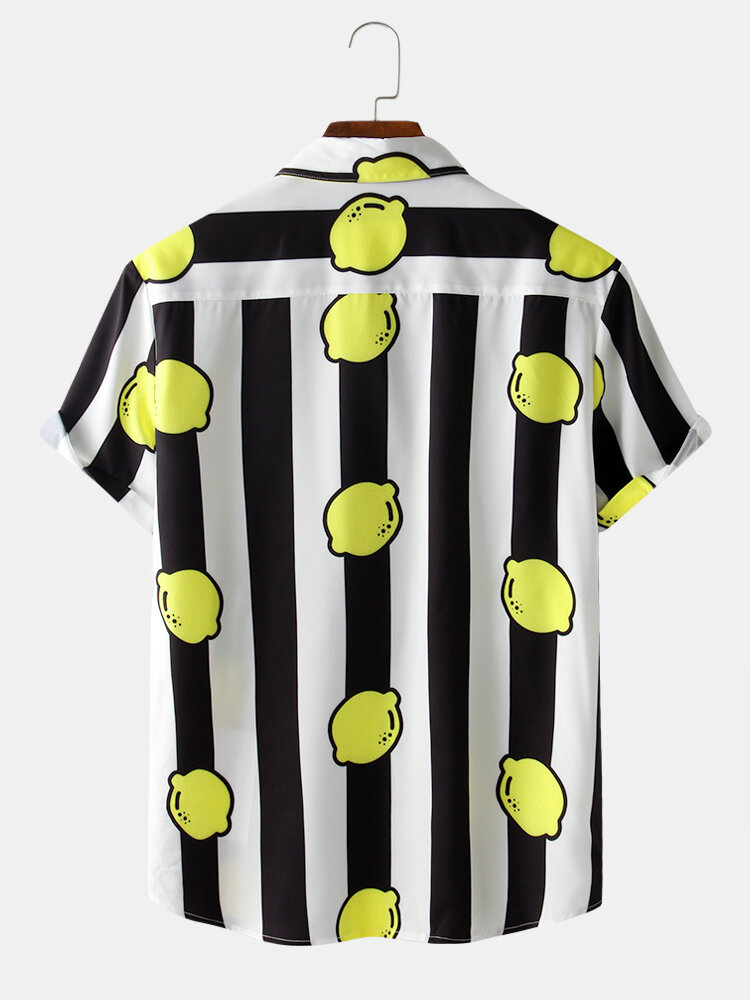 Mens Striped Lemon Print Turn Down Collar Short Sleeve Shirts – White M