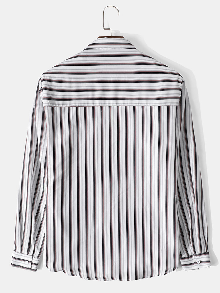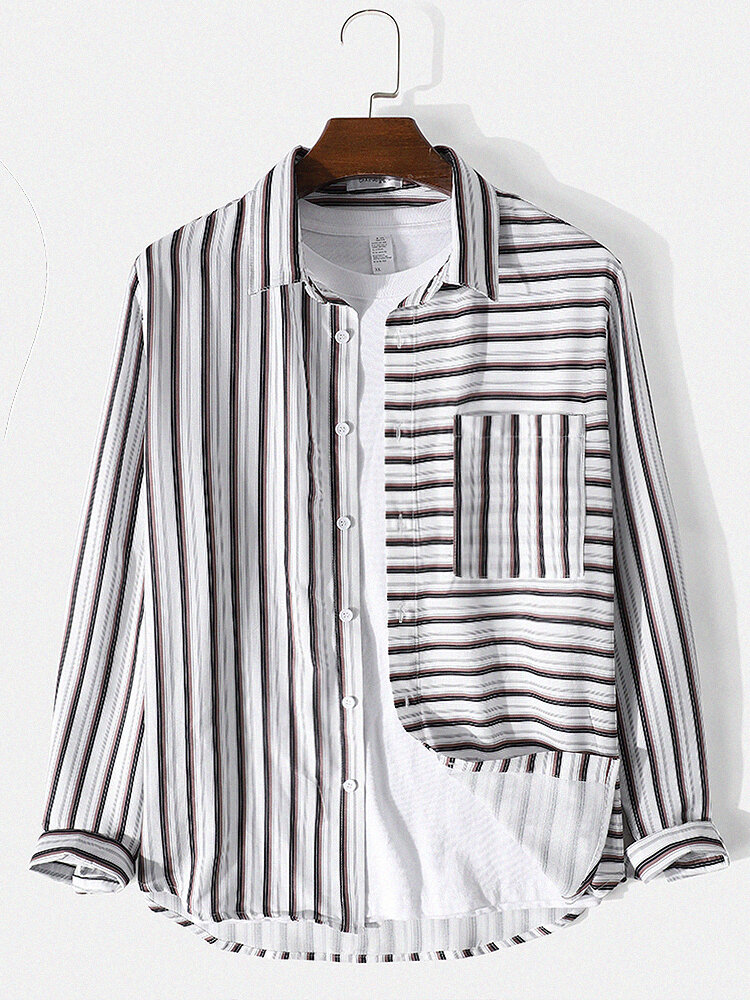 Mens Striped Mix Print Chest Pocket Lapel Long Sleeve Shirt – White S