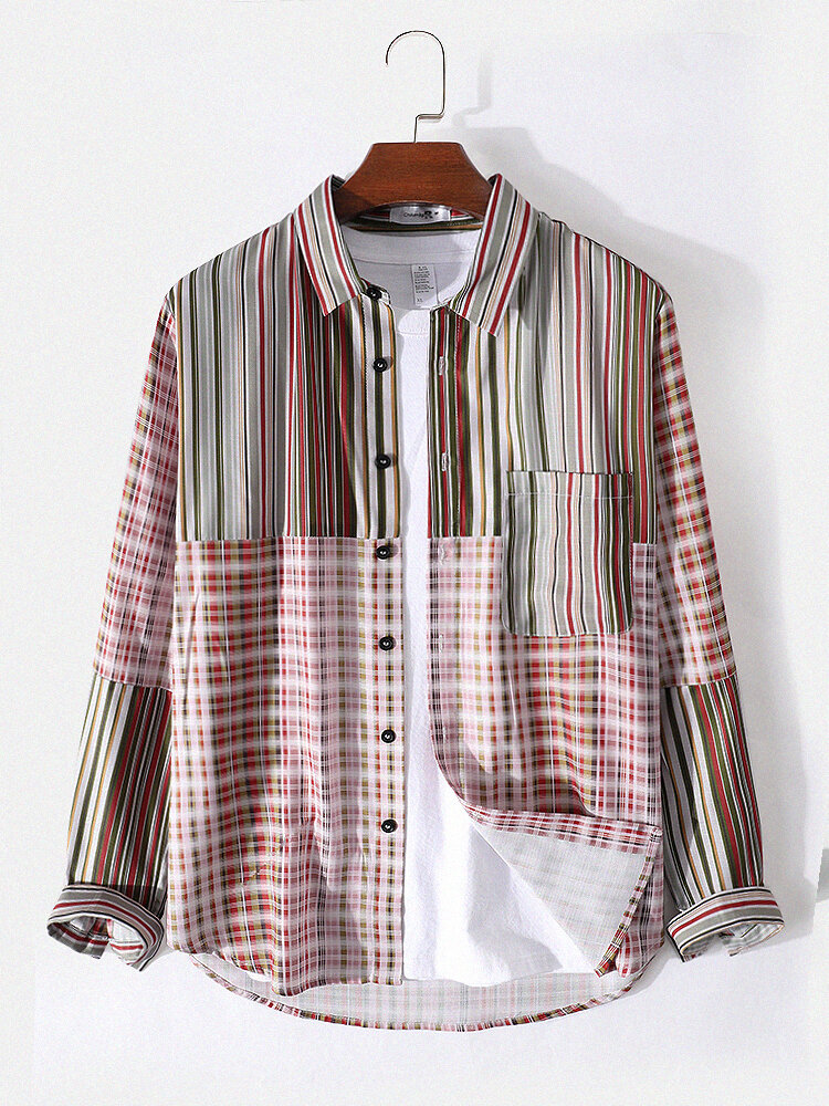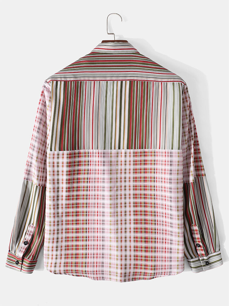 Mens Striped Plaid Mix Print Patchwork Lapel Long Sleeve Shirt – Pink S