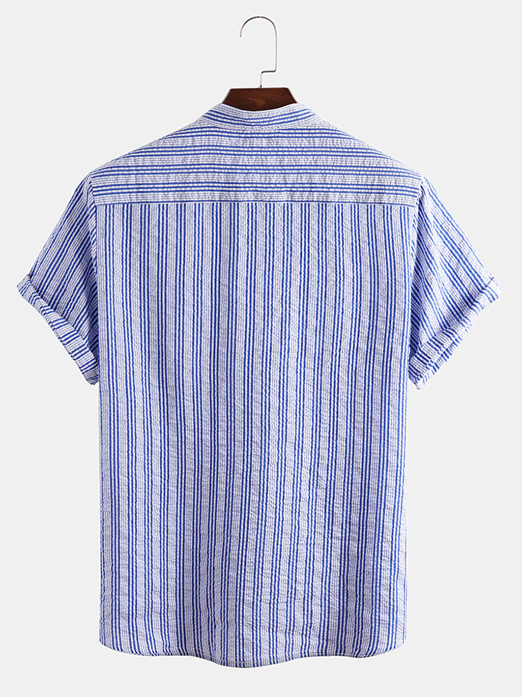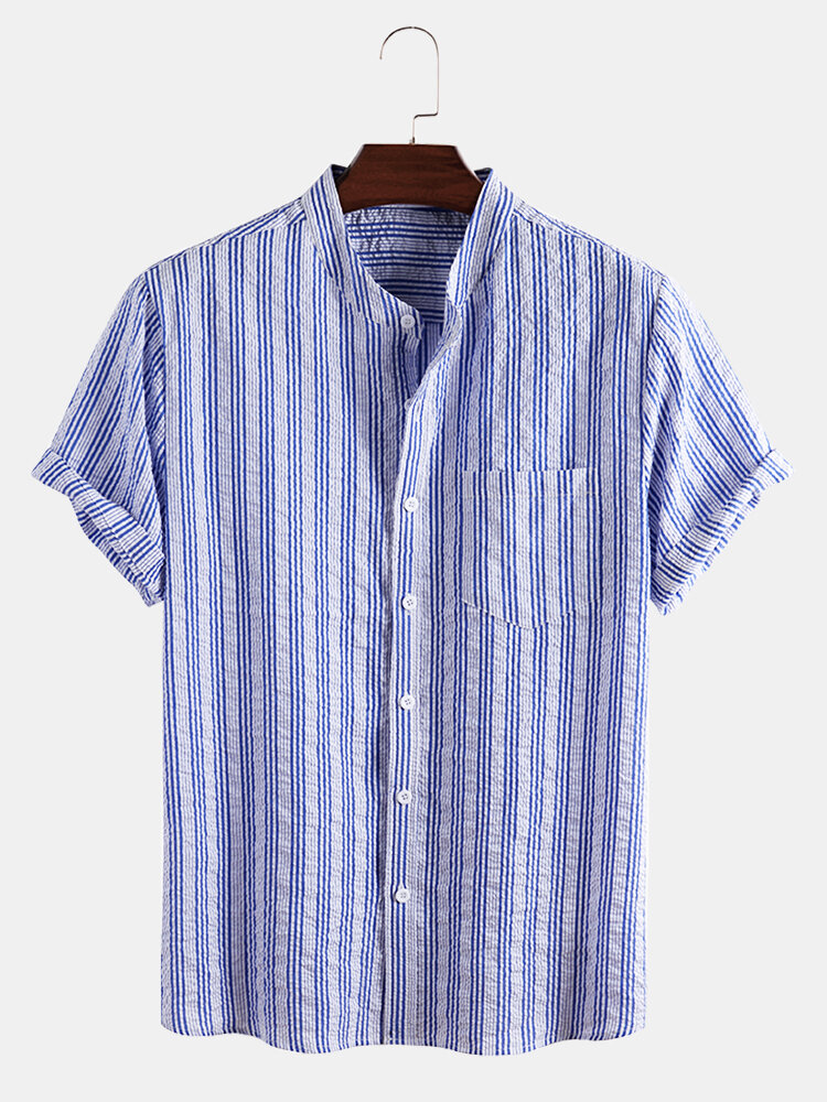 Description:Decoration:Pocket,ButtonFit Type:Regular FitMaterial:PolyesterNeckline:Stand CollarPattern Type:StripedScene:Leisure,CasualSeason:Spring,SummerSize:XXL,L,S,XL,MSleeve:Short SleeveStyle:Casual
