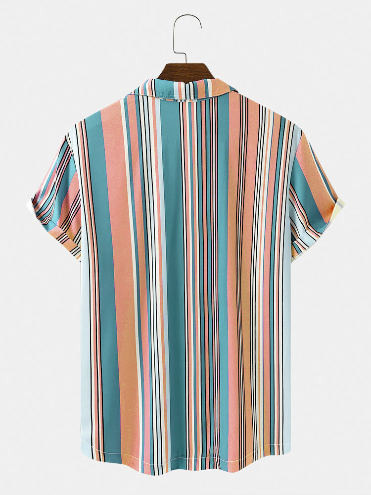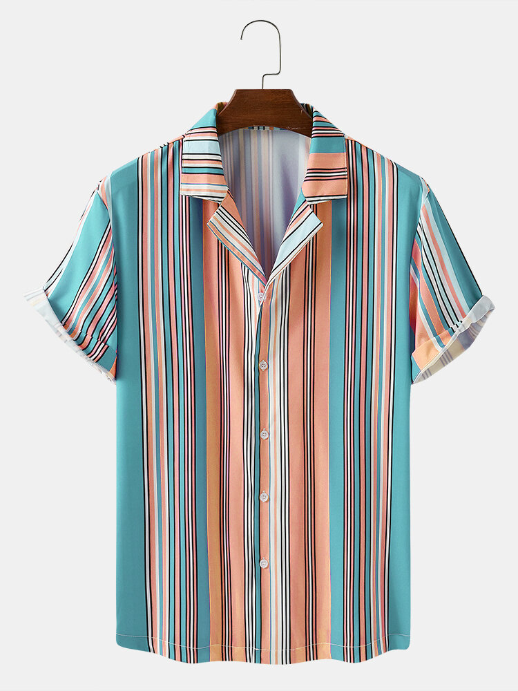Mens Striped Revere Collar Short Sleeve Shirts – Pink S