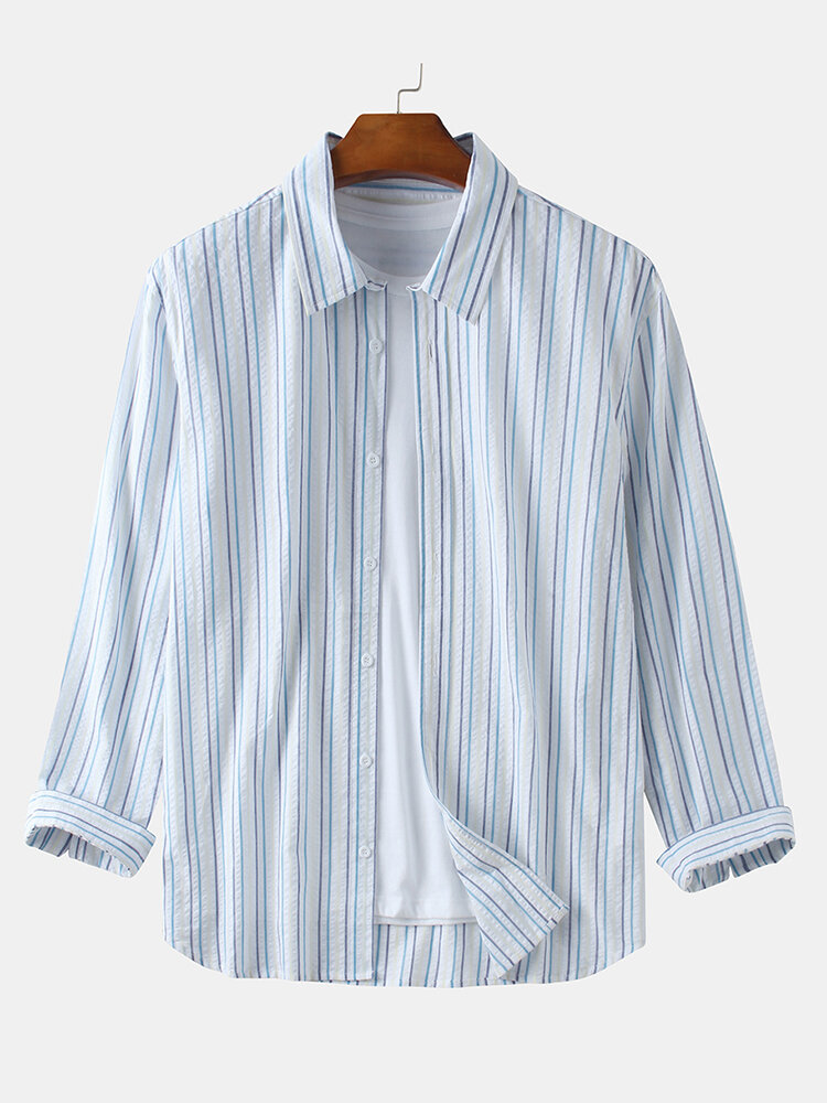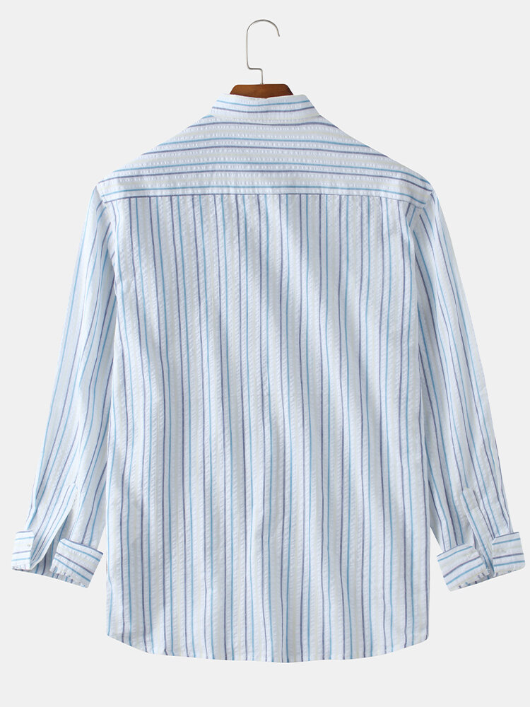 Mens Striped Turn Down Collar Long Sleeve Shirts – Blue M