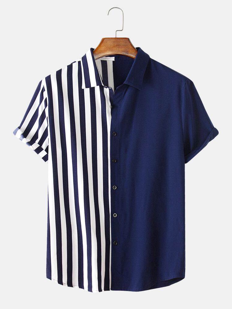 Mens Stripes Patchwork Design Splicing Breathable Turn Down Collar Shirts – Black M