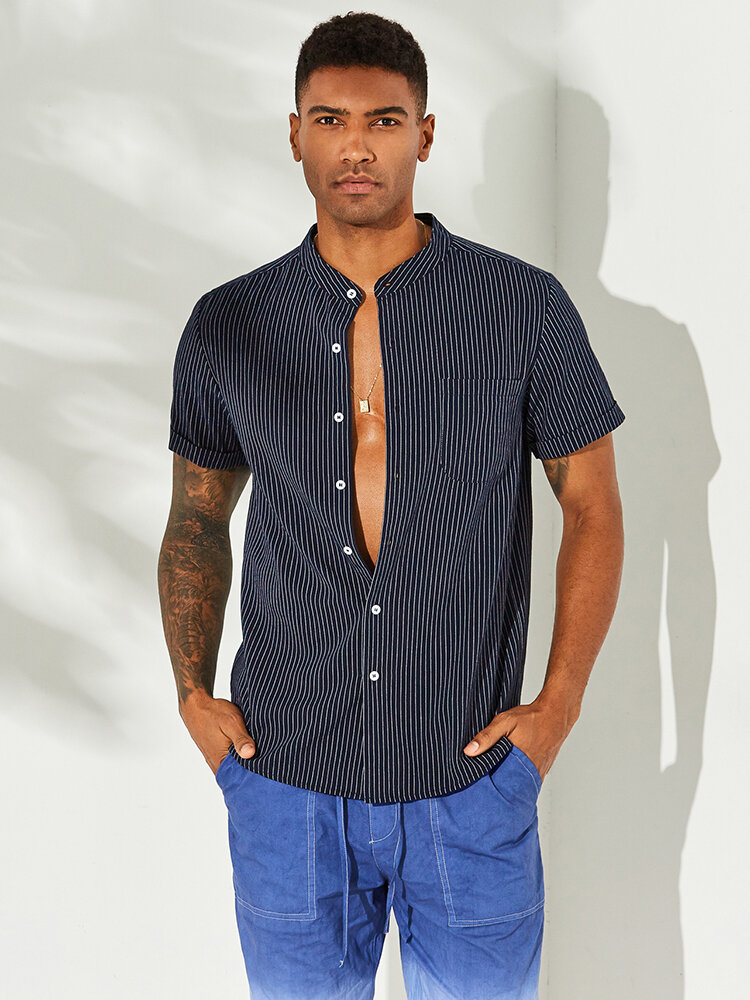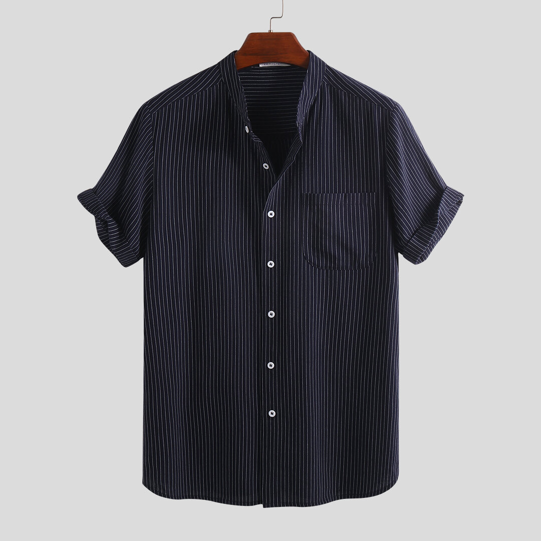 Item Type: ShirtsPattern Type: StripeGender: MenFit Type: FitStyle: Casual, FashionThickness: RegularCollar: Stand CollarSeason: Spring, SummerMaterial: 100% CottonColor: Blue, KhakiCuff Type: Shirt SleevesOccasion: LeisureSleeve Length: Short Sleeve