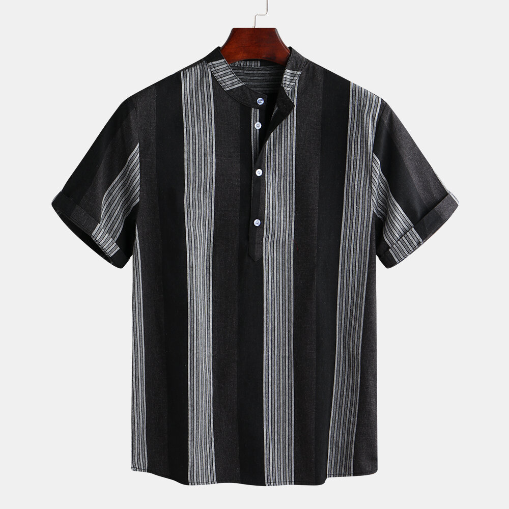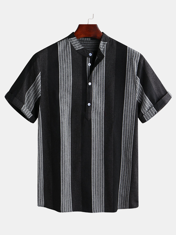 Item Type: ShirtsPattern Type: StripeGender: MenFit Type: FitStyle: Casual, FashionThickness: RegularCollar: Stand CollarSeason: Spring, SummerMaterial: CottonColor: Black, Coffee, RedCuff Type: Shirt SleevesOccasion: LeisureSleeve Length: Short Sleeve