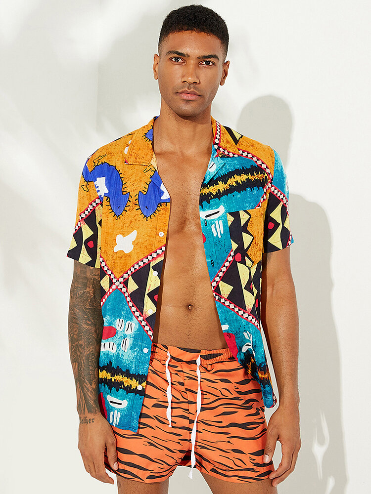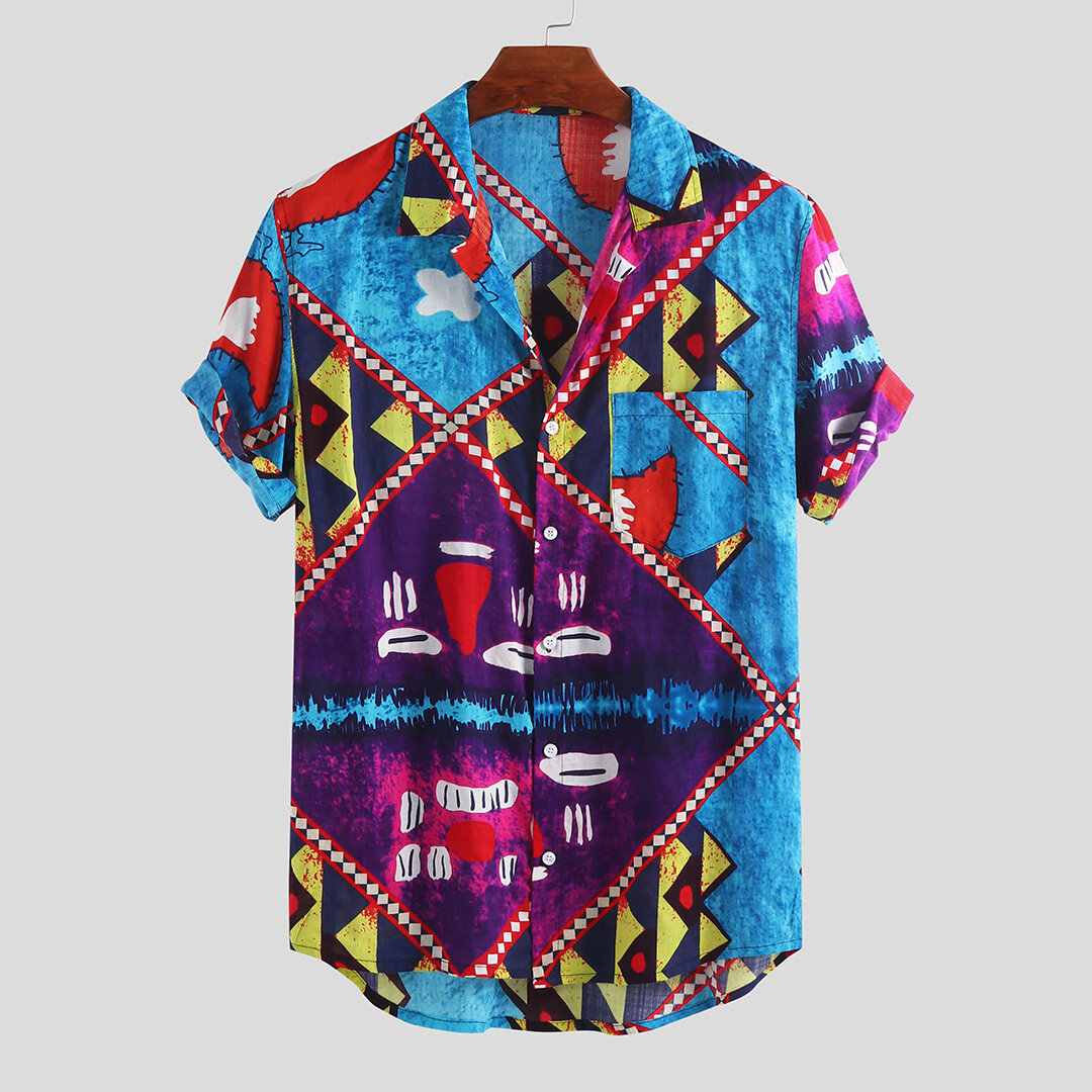 Item Type: Shirts Pattern Type: PrintingGender: Men Fit Type: FitStyle: Casual, Fashion, Ethnic Style Thickness: RegularCollar: Turn-down Collar Season: Spring, SummerMaterial: Cotton, Rayon Sleeve Length: Short SleeveColor: Yellow, Lake Blue, PurpleCuff Type: Shirt Sleeves Occasion: Leisure Package includes