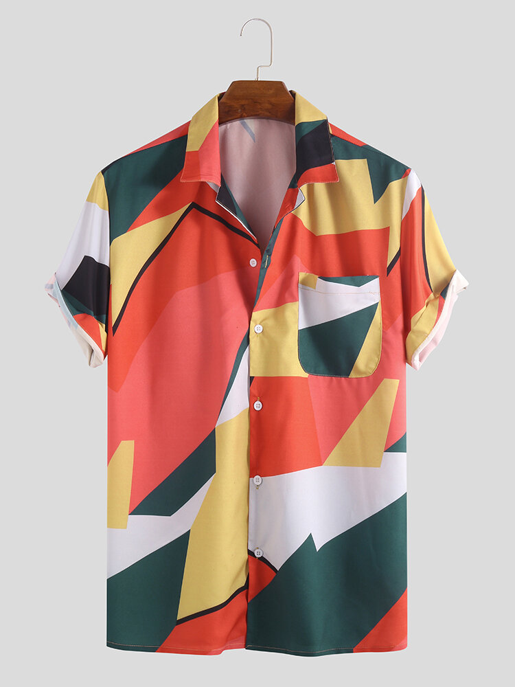 Brand: ChArmkpRItem Type: Shirts Pattern Type: ColorblockGender: Men Fit Type: FitStyle: Casual, Fashion, Ethnic Style Thickness: RegularCollar: Turn-down Collar Season: Spring, SummerMaterial:Polyester Sleeve Length: Short SleeveColor: Blue Yellow RedCuff Type: Shirt Sleeves Occasion: Leisure Package includes