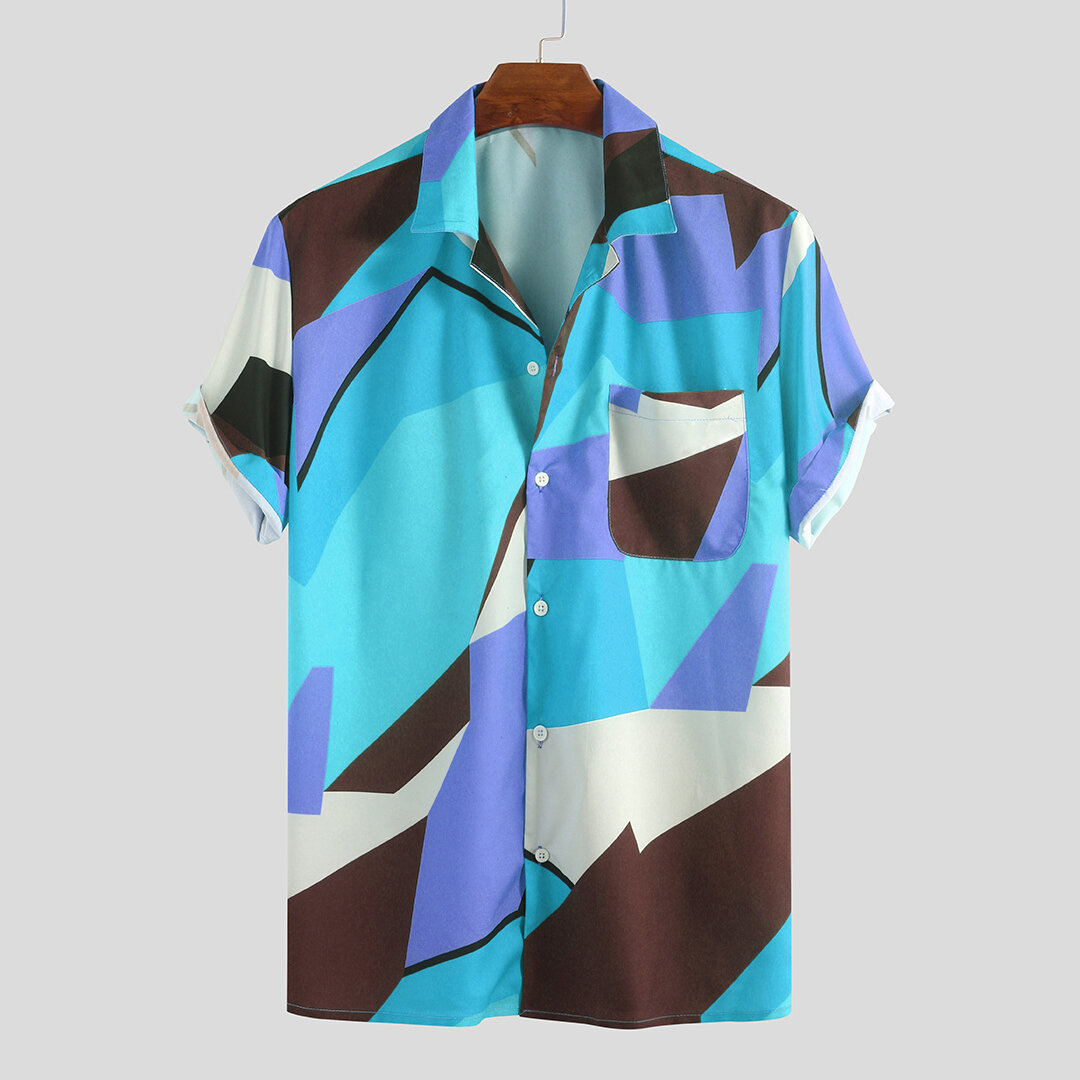 Mens Summer Colorblock Contrast Printed Casual Shirts – L Blue