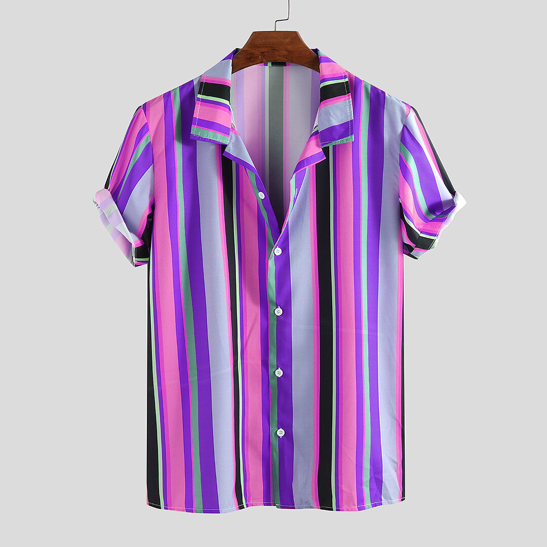 Item Type: Shirts Pattern Type: StripeGender: Men Fit Type: FitStyle: Casual, Fashion Thickness: RegularCollar: Turn-down Collar Season: Spring, SummerMaterial:100% Polyester Sleeve Length: Short SleeveColor: Blue,Red,PurpleCuff Type: Shirt Sleeves Occasion: Leisure Package includes