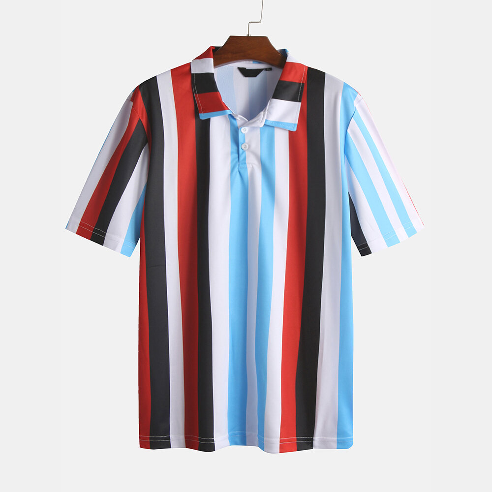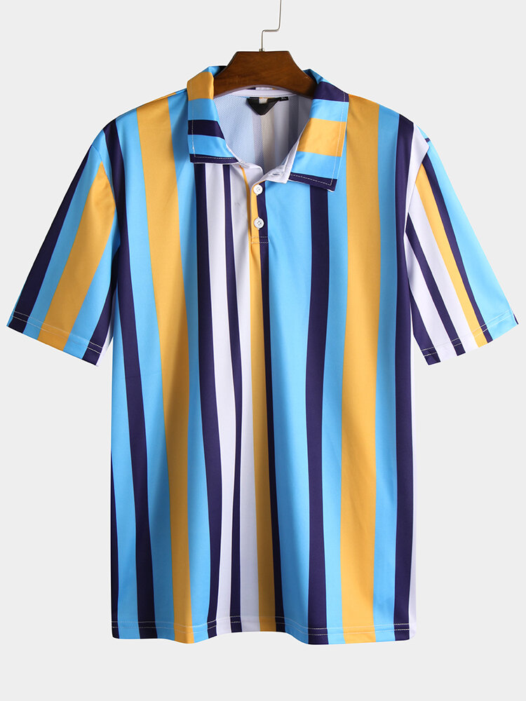 Item Type: ShirtsPattern Type: StripeGender: MenFit Type: FitStyle: Casual, FashionThickness: RegularCollar: Turn-down CollarSeason: Spring, SummerMaterial: PolyesterColor: Red, YellowCuff Type: Shirt SleevesOccasion: LeisureSleeve Length: Short Sleeve