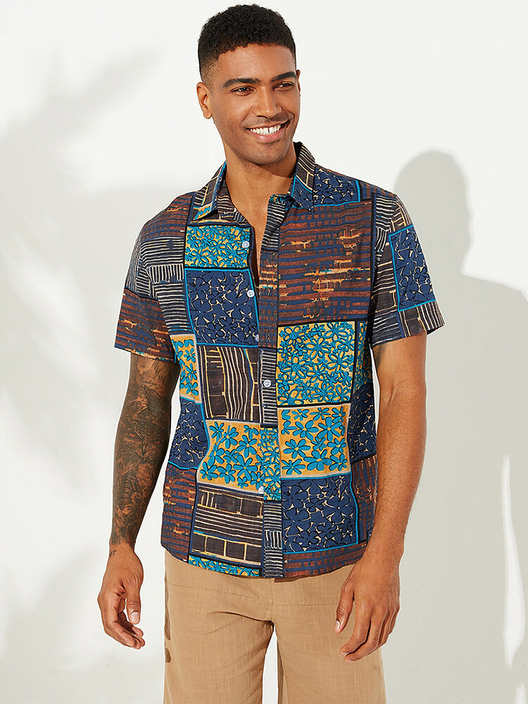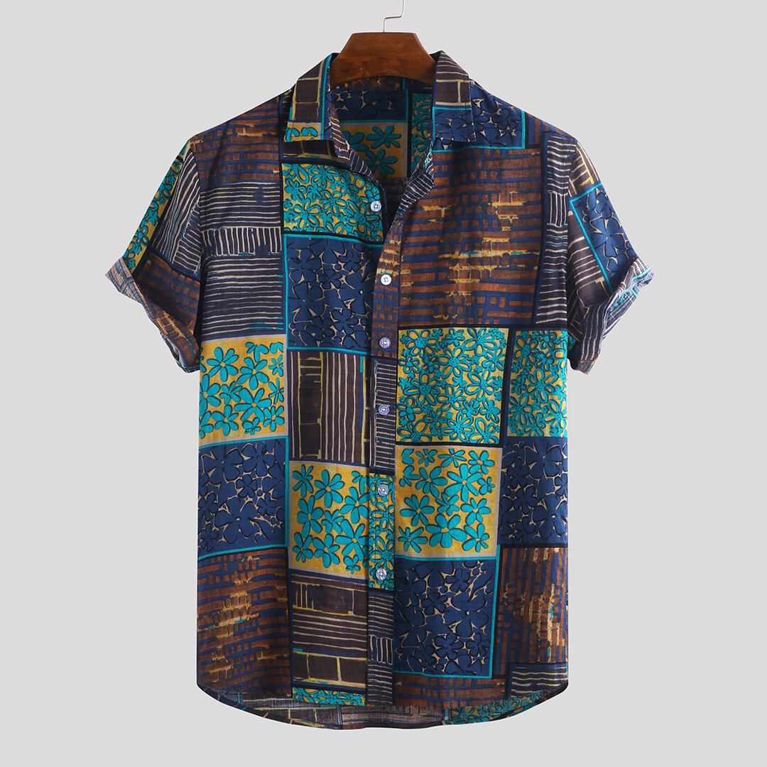 Brand Name: ChArmkpR Sleeve Length: Short SleeveItem Type: Shirts Pattern Type: Pattern PrintedGender: Men Fit Type: FitStyle: Casual, Fashion, Ethnic Style Thickness: RegularCollar: Turn-down Collar Season: Spring, SummerMaterial: Cotton, Rayon Color: Orange Red, BlueCuff Type: Shirt Sleeves Occasion: Leisure Package includes