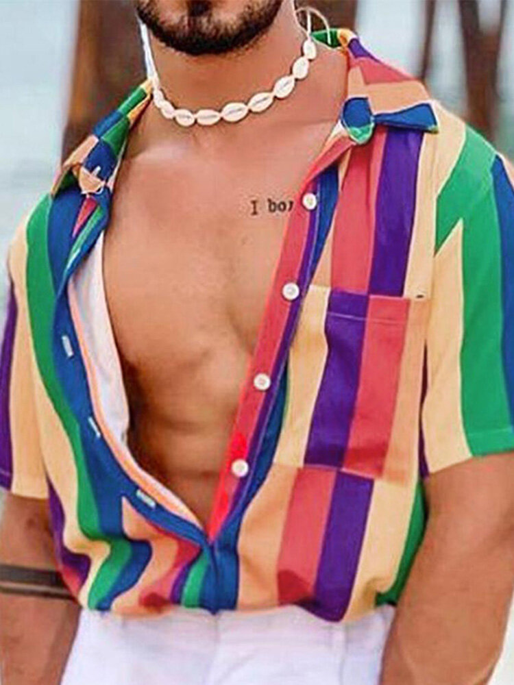 Brand Name: INCERUNSleeve Length: Short SleeveItem Type: ShirtsPattern Type: Rainbow StripesGender: MenFit Type: LooseStyle: Urban, FashionThickness: RegularCollar: Turn-down CollarSeason: SummerMaterial: PolyesterColor: ColorfulCuff Type: Shirt SleevesOccasion: Casual, Vacation