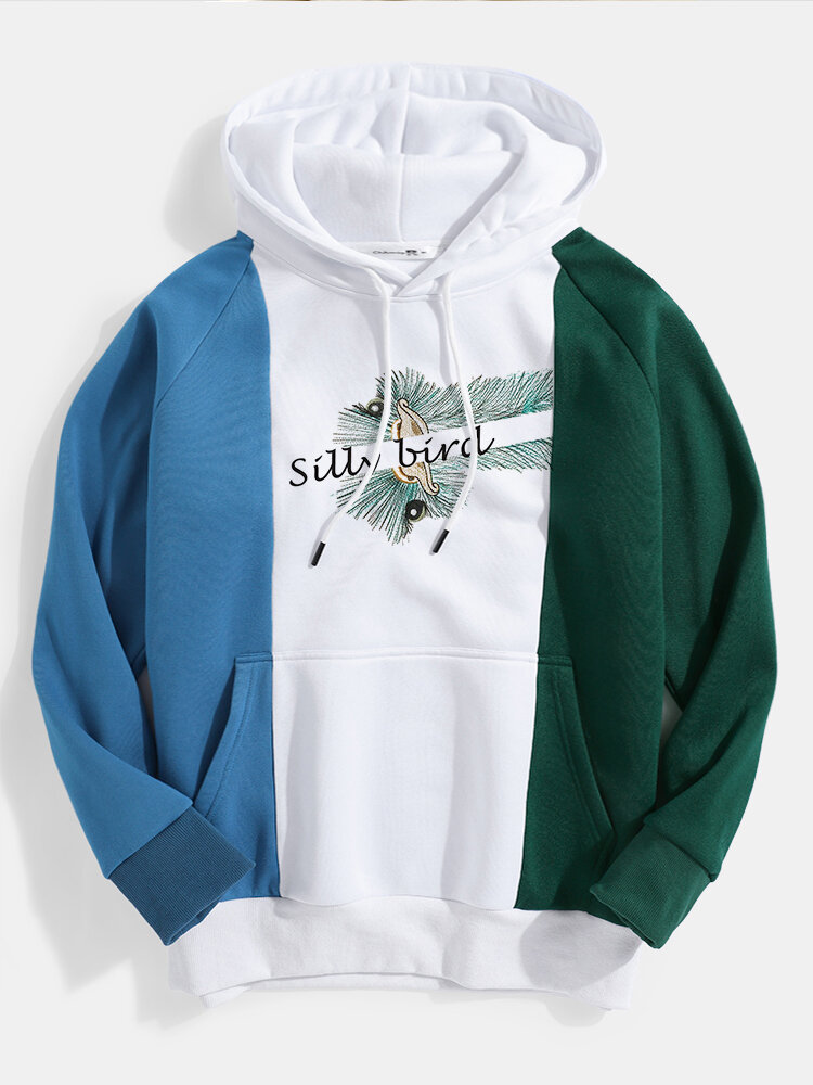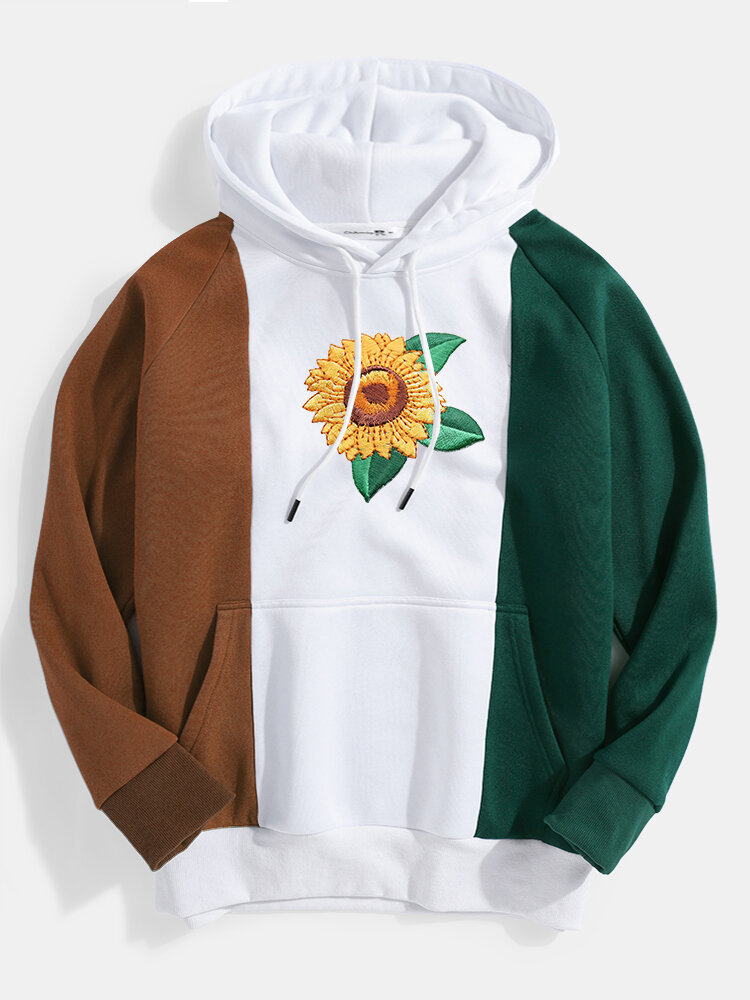 Mens Sunflower Embroidery Contrast Color Patchwork Long Raglan Sleeves Hoodies – Blue S