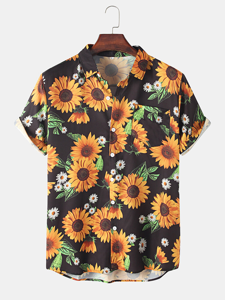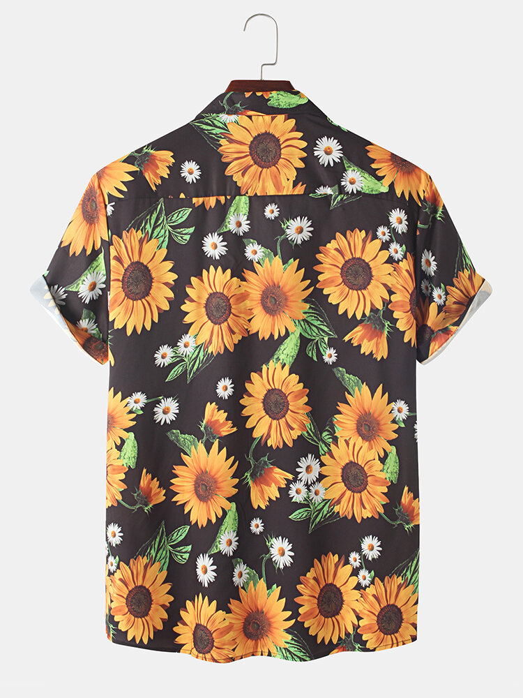 Mens Sunflower & White Daisies Print Lapel Short Sleeve Shirt – Black S